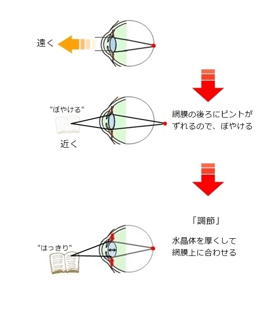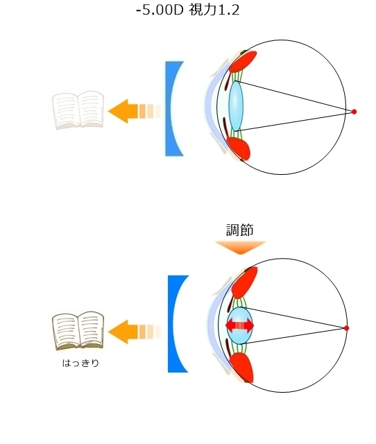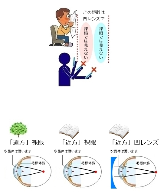 網膜のかなり手前に焦点があって近くを見てもまだ網膜上にピントが合わないから、凹レンズで網膜上にピントを合わせるので、水晶体を厚くする「調節」とは無縁です。