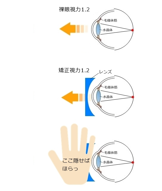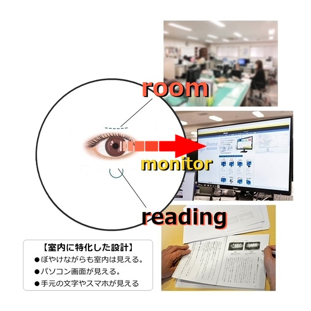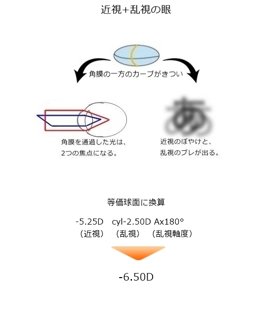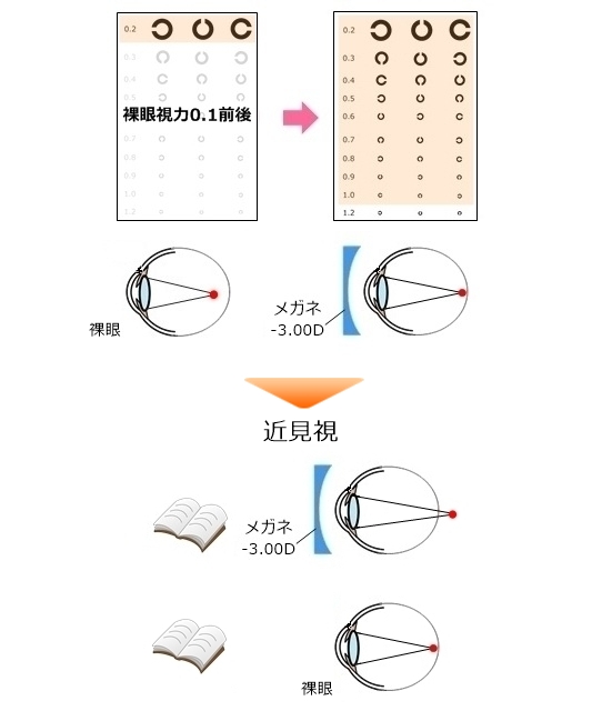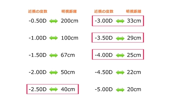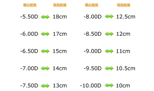 | 「近視」の眼だけではなく、近視性乱視の眼も含まれます。コンタクトレンズを買う人で、あえて乱視用にしない人は”等価球面換算”と言い、乱視のパワーの半分を近視の度数に足す方法を用います。こういう度数の人も裸眼の明視距離が非常に近いです。 |